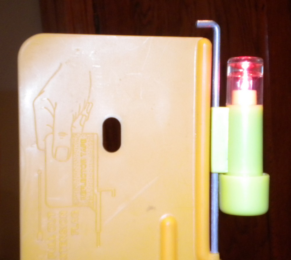 The flag holder also has an antenna like piece sticking up for you to turn the spool easily (herein dubbed as the “winding handle”). Many of the board-style tip-ups have the winding handle at the bottom of the spool. This Frabill spool has a piece of cork under it for you to sink your hook into for safe storage, so they couldn’t put the winding handle there. I found this winding handle awkward at first because it is difficult to use when you want to wind the line up at the end of your fishing trip. But it is handy when the line is “deployed.” It just takes a little getting used to winding the line a different way than you’re used to.