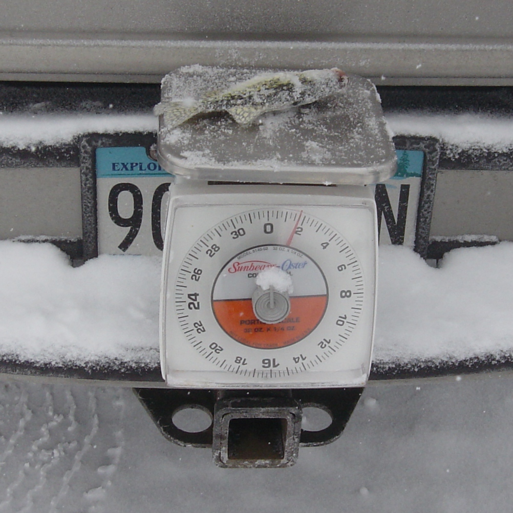 After lunch, I decided to fish outside for a little bit while Rob and Steve kept trying in their shelter. Steve said some people were catching some crappie about 40 feet away, so I found an open hole out that way and jigged a little with my setup. It only took a few minutes to catch my first crappie. Steve ended up catching one as well so I brought both of them to the weigh in station. They were both about 2 oz.