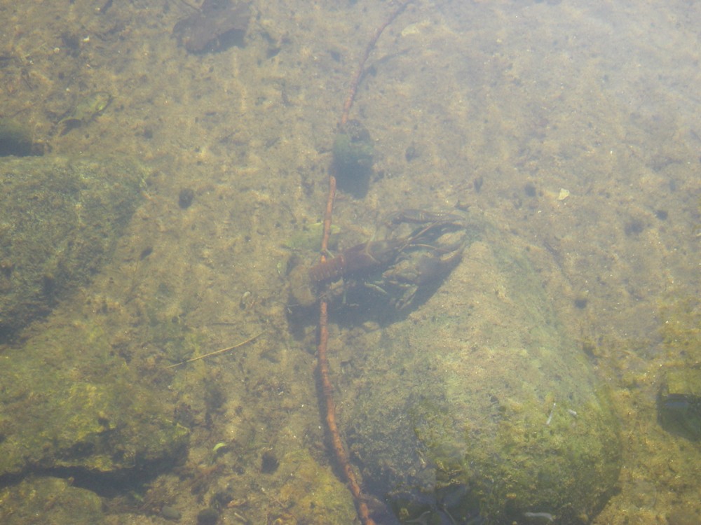 I retied a new swivel and hooked on a Berkeley power worm. As I cast the new lure, I watched as a giNORmous crayfish scuttled across the rocks parallel to shore just out of my reach. (My apologies for the poor pic. I took a bunch and this was the best one.)
