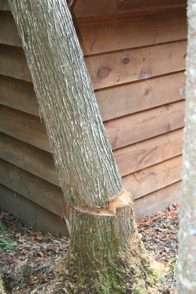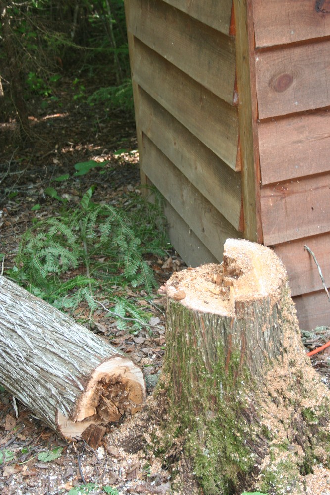 We spent much of the morning and afternoon taking down a couple of 30 ft trees because one of them was growing into the roof of the outhouse. We ended up taking down two trees (and a third little one) because the one was in the way of the other in the direction we wanted to fell it.