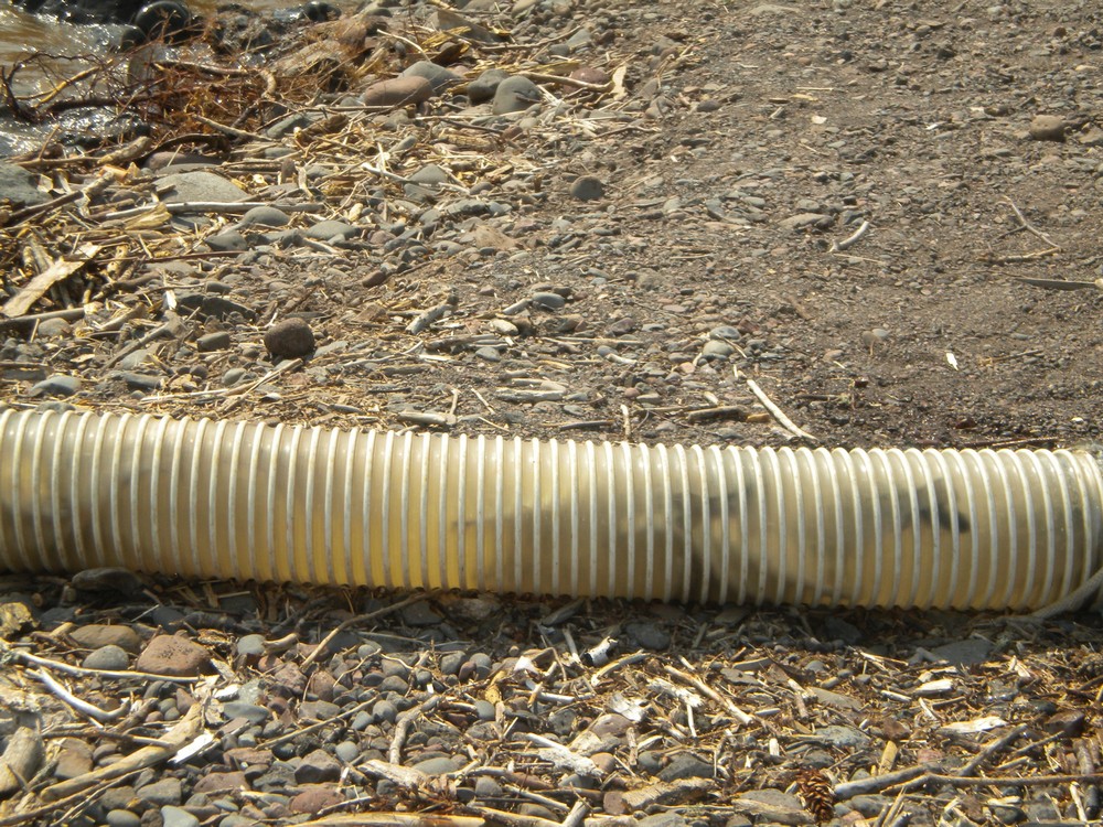 After visiting the holding tanks, we headed to the mouth of the French River where they were going to release the fish. The 7 inch flexible tubes that would make the slide to freedom were already there. The tank trunk backed up a few minutes later. Two workers hooked up one end of the tubes to the first tank while two others waded into the river to guide the other end. One of the truck workers stood on a platform over the tube connection, pulled a lever, and the fish made their way into the wild. I swear I could hear them go, “weeeeeeee!”