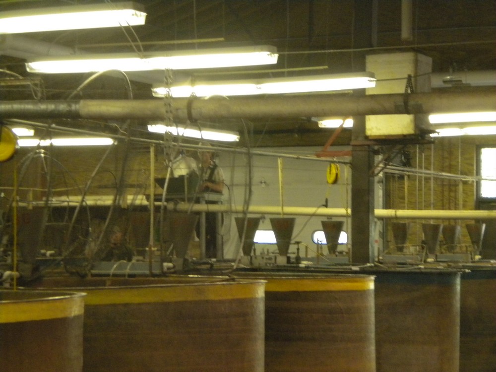 He told us they were loading up the truck with Rainbow Trout to release into the French River. The truck had three tanks holding about 500 lbs of fish each. The thing we thought was a scale inside was actually a funnel. The fish were dropped into the funnel and the funnel was attached to PVC pipes that went outside the building to the truck. They were just about done with the last tank so we would be able to watch them release the fish.