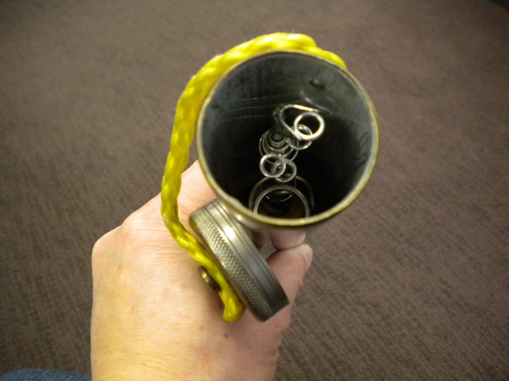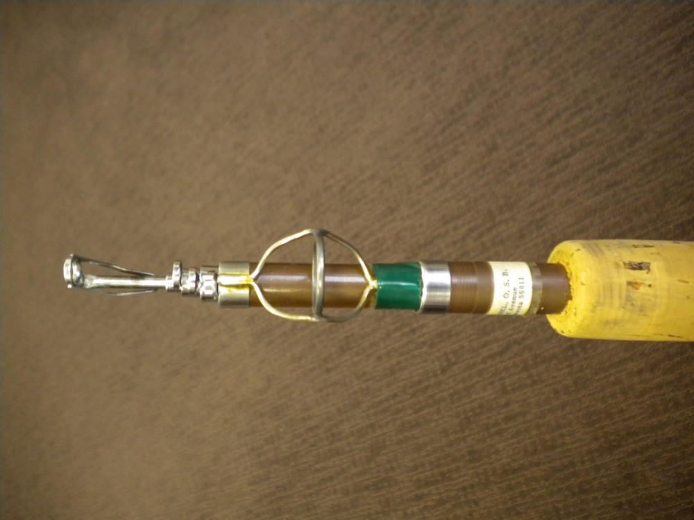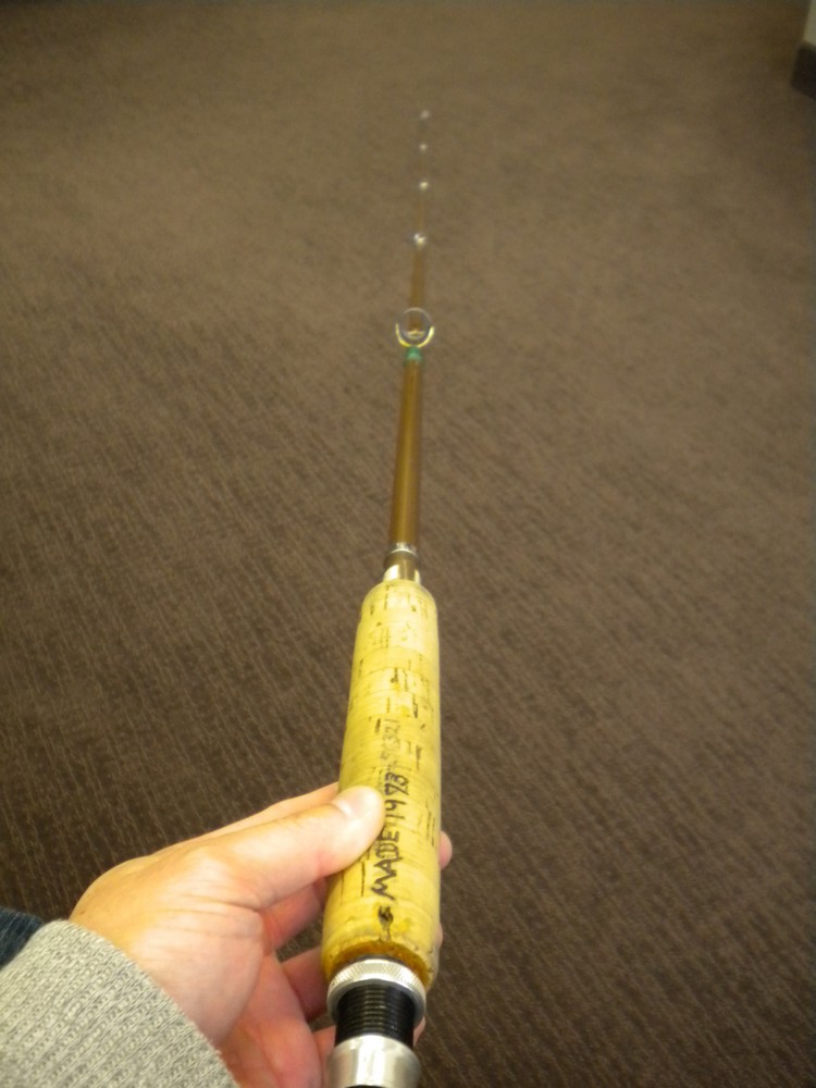 Then Dan pulled out a rod tube. It was only about three feet long, so I figured it was a broken down fly rod. It wasn’t. It was a retractable rod. As you can see, it was made out of the plastic with the classic brown of the ’60s. I can’t imagine the rod was very sensitive.