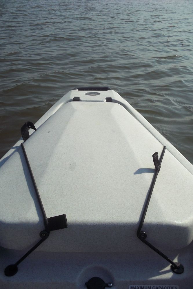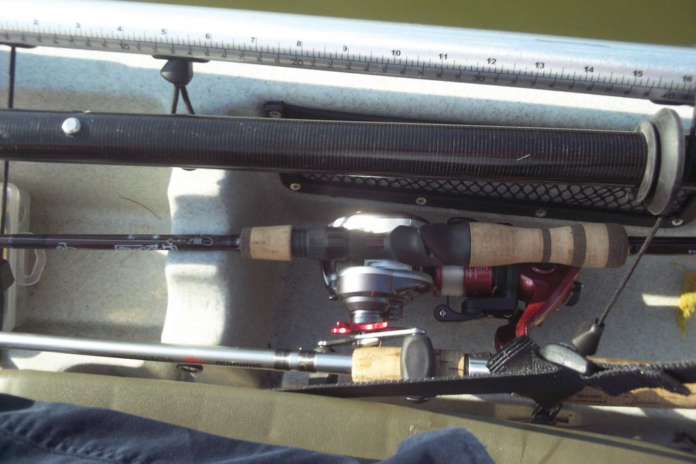 During my demo three years ago, I really loved the idea of the horizontal rod holders. I thought it would be nice to be ale to store rod and reels horizontally so that you don’t have to remove them from storage. However, in practice, the space is a bit tight and reels can get in the way of each other. I would recommend one rod and reel on each side and the built-in vertical rod holders (behind the seat) for any extras. I currently only have one spinning reel and one baitcasting reel, so it’s not an issue for me. I did bring along an extra spinning reel and that’s how I discovered the reels get in the way of each other.